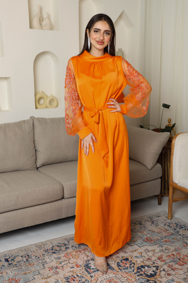 فستان كريب ناعم بياقة مرتفعة بأكمام تل شفافة مزينه بكريستال وخرز وبأزرار على الككم - حزام خارجي