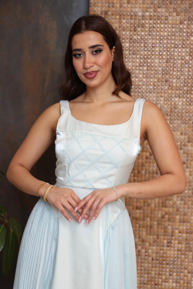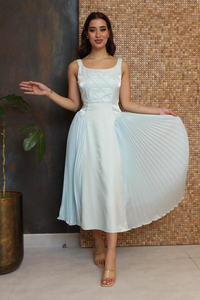 فستان انيق بياقة دائرية بدون اكمام بقصة كلوش من الأسفل مزين بكسرات من الجوانب