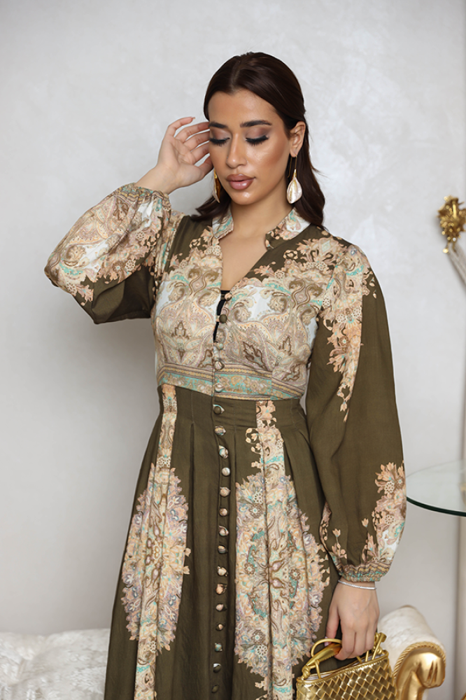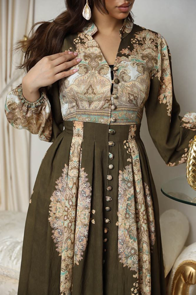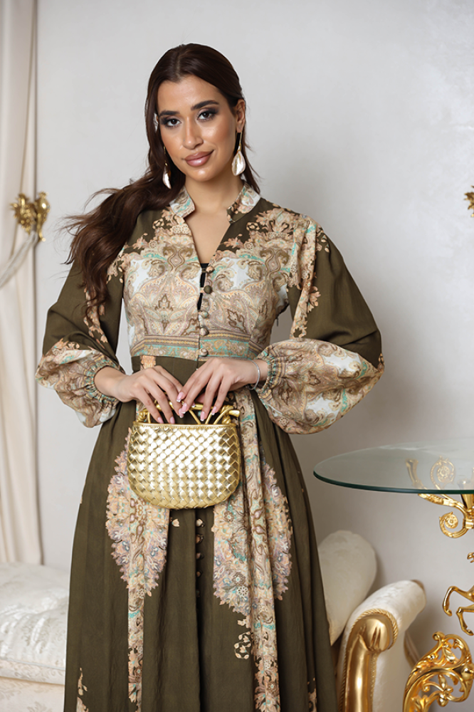 فستان كلاسك بياقة عالية بفتحه من الصدر بأكمام طويلة مزمومه من الأطراف مزين بأزرار اماميه للأسفل