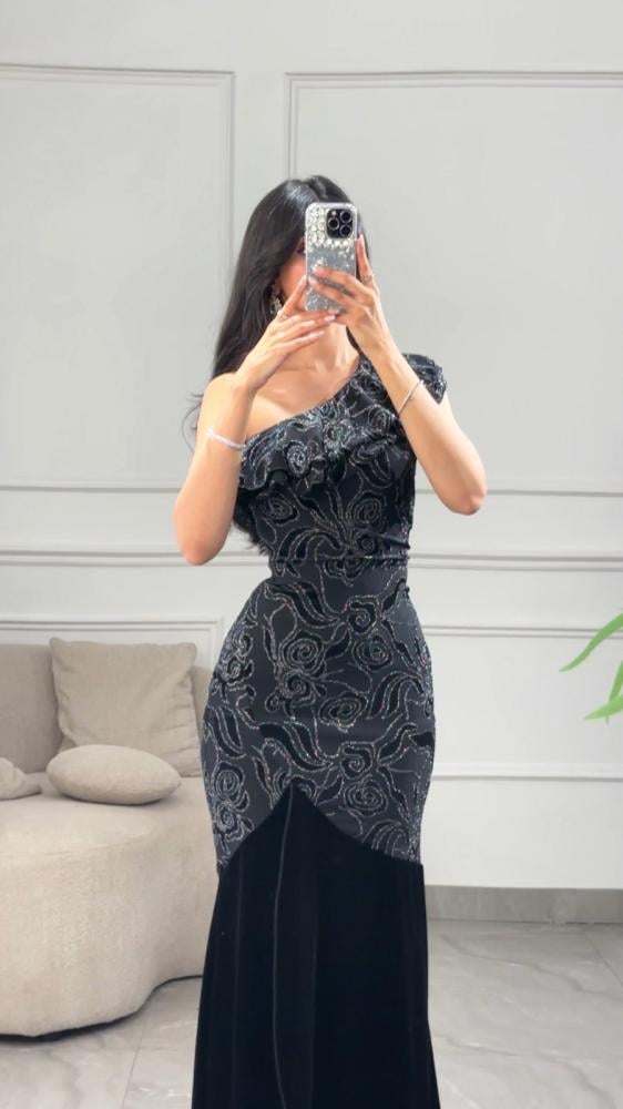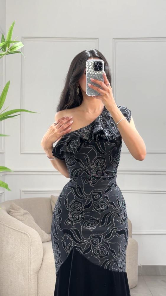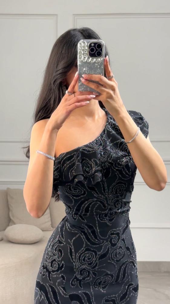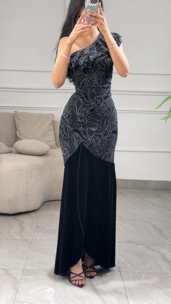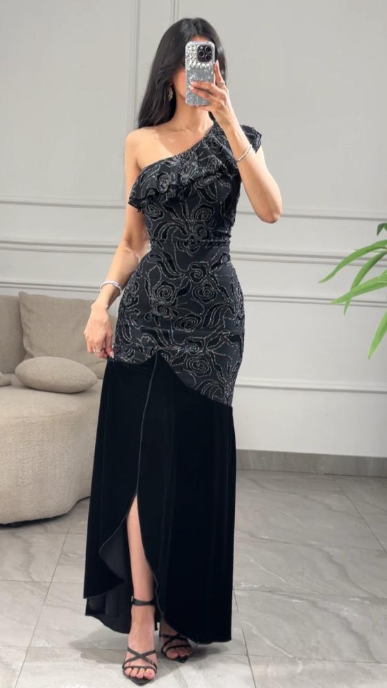 فستان مخمل بنقش ورود بارز بقصة الكتف الواحد بقصة لف من الأسفل مزين بكشكشة على الصدر و الكتف