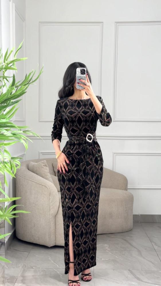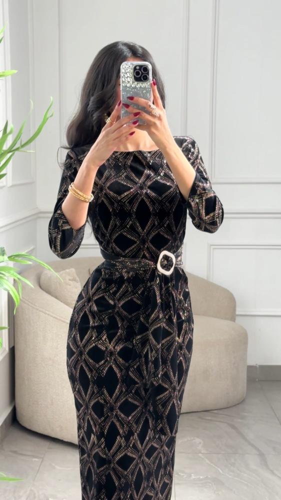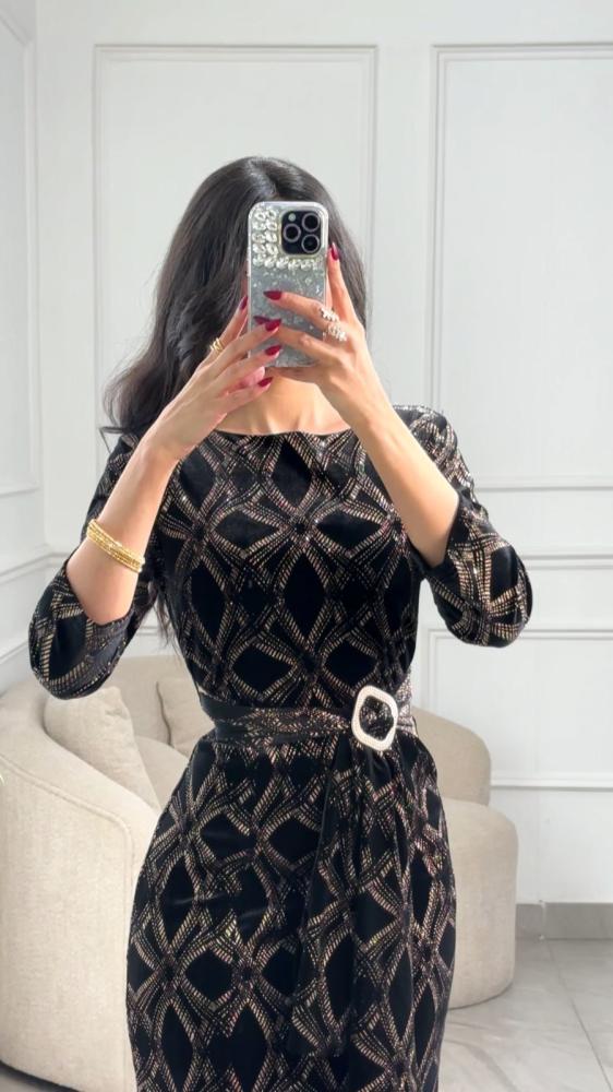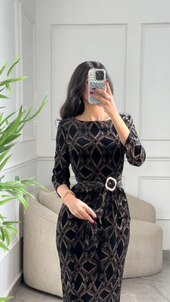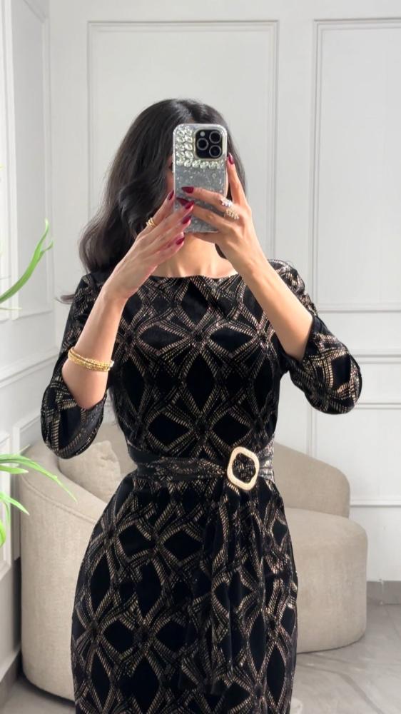 فستان مخمل بياقة دائرية بحياكة مذهبه بحزام ذاتي على الخصر بفتحه من الأسفل