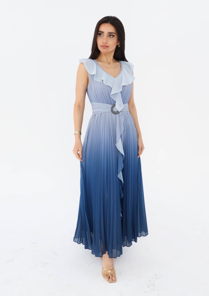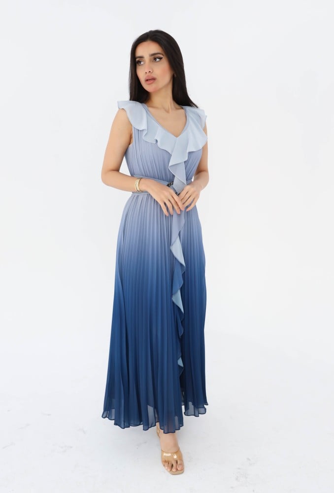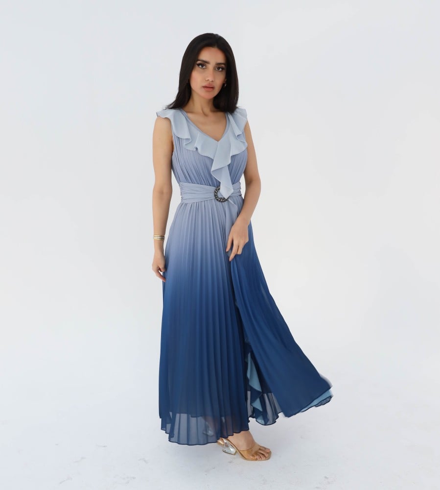 فستان بطابع مموج بياقة V بدون اكمام مزينة بكشكشة على الصدر متصل الى الأسفل مزين بكسرات بالكامل بثنايا على الخصر مزينة بكريستال.