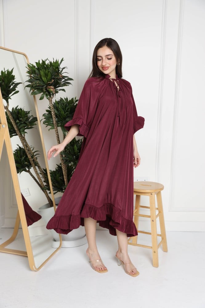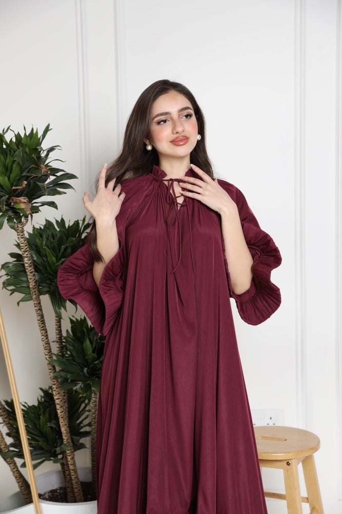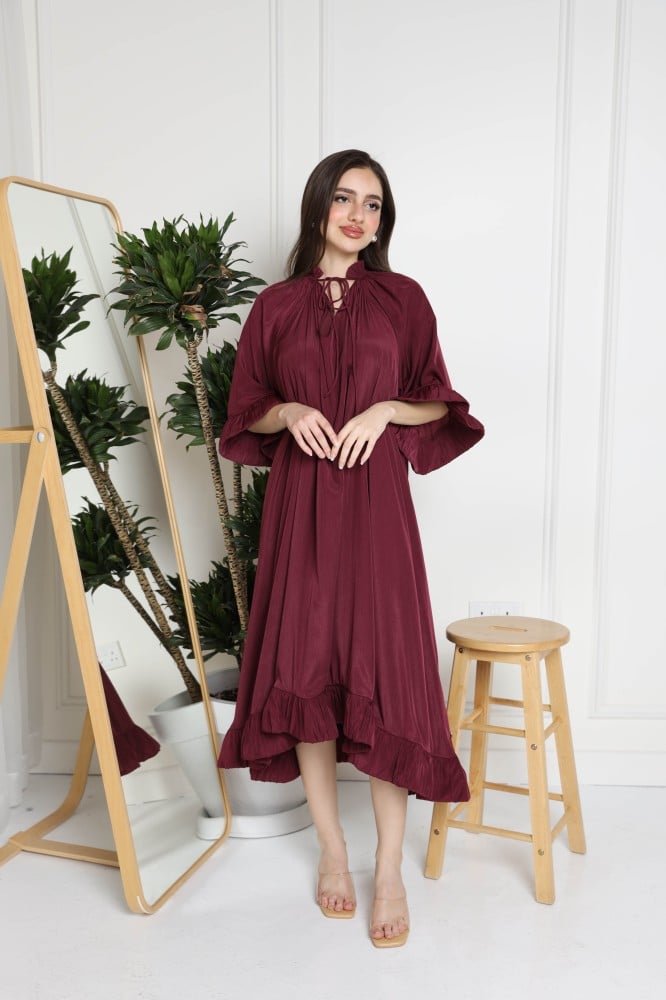 فستان ميد كلوش غير متماثل الطول بفتحة من الصدر مزين بكشكشة على الرقبة ورباط باكمام حيران مكشكشة من الاطراف .