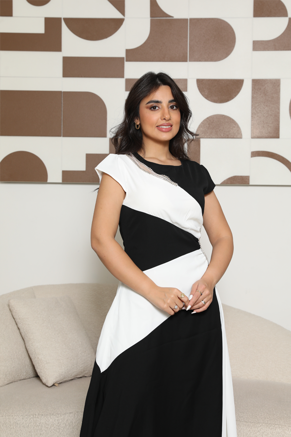 فستان ميد بدون اكمام بياقة دائرية بفتحة جانبية من الصدر الى الظهر مغطاه بتل ومزينة بكريستال بالإضافة الى كريستال على جانب الخصر