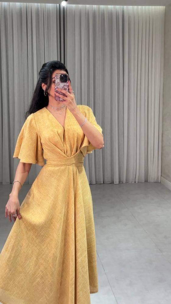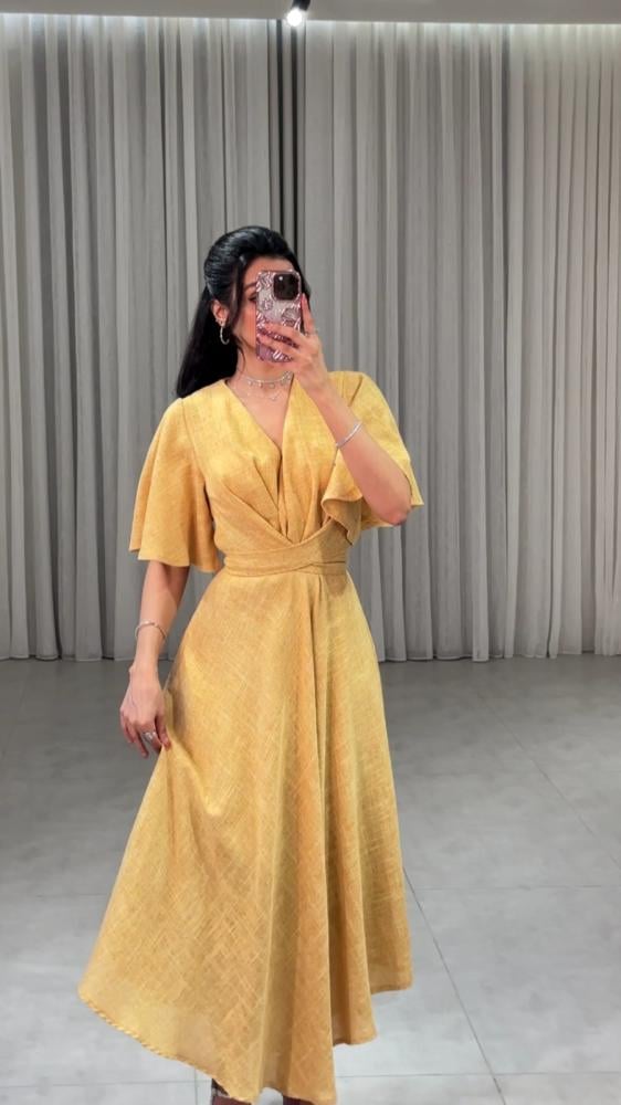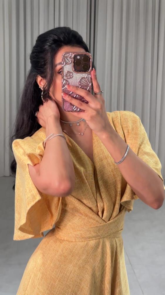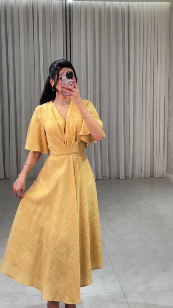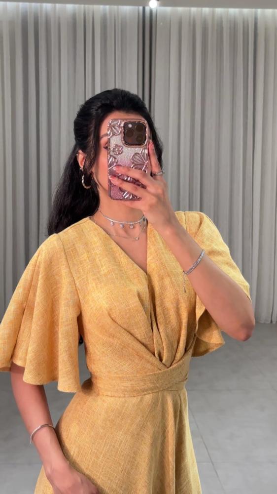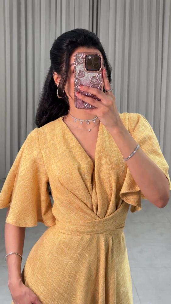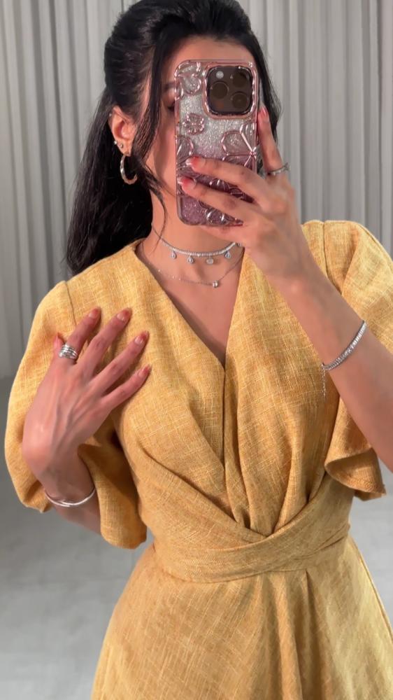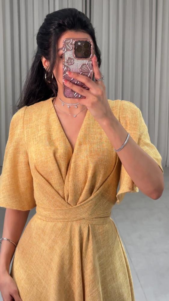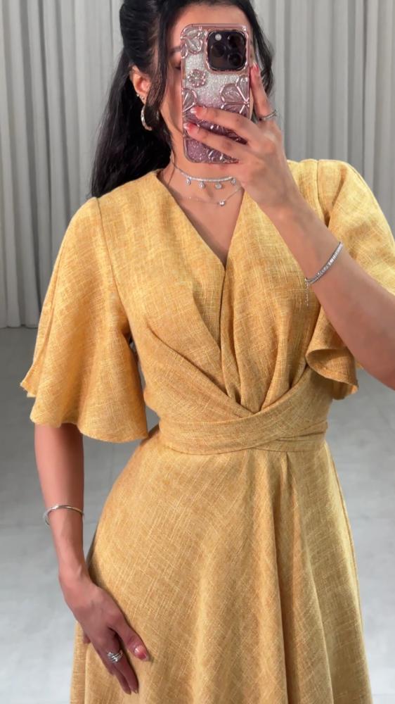 فستان لف من الصدر غير متماثل الطول بأكمام قصيرة واسعة مزين بكسرات من الصدر بحزام ذاتي على الخصر وبقصة كلوش