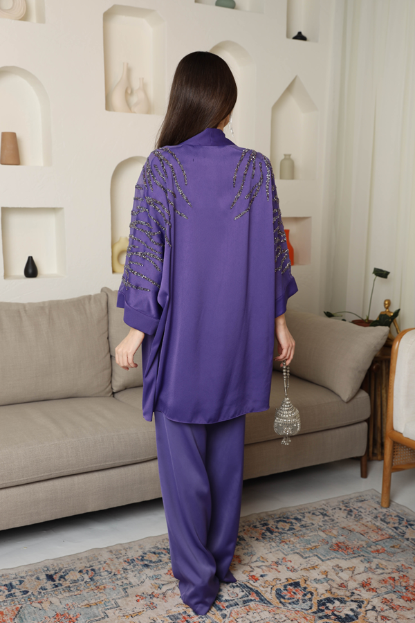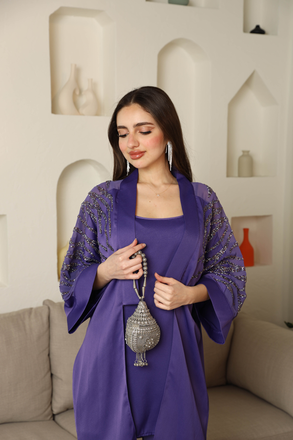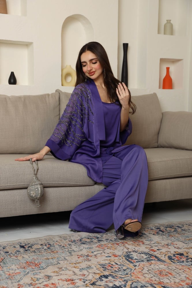 طقم مزين بخرز و ترتر طقم ثلاث قطع بدي حفر داخلي بفتحات من الجوانب بلوزه مفتوحة بياقة مرتفعة بأكمام قصيرة مزينة بخرز وترتر بنطلون طويل كريب بقصه واسعه