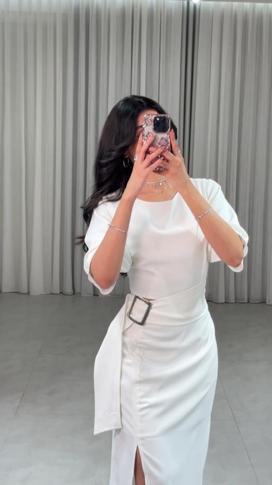 فستان كريب ميد بفتحة من الخصر WHITE ~