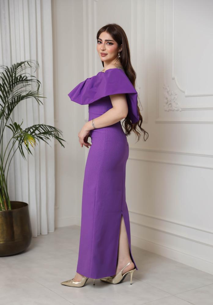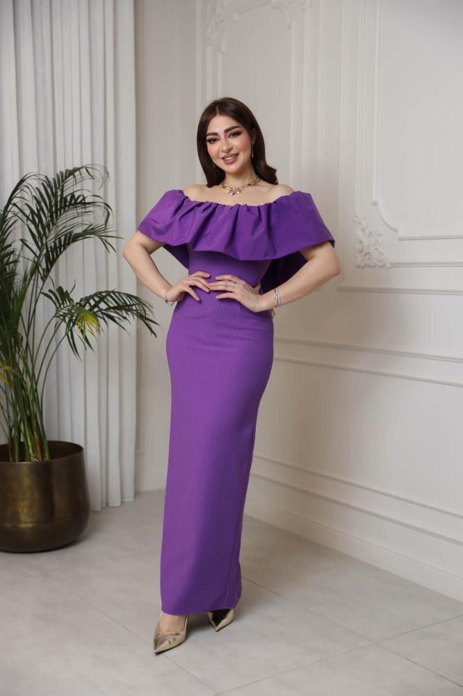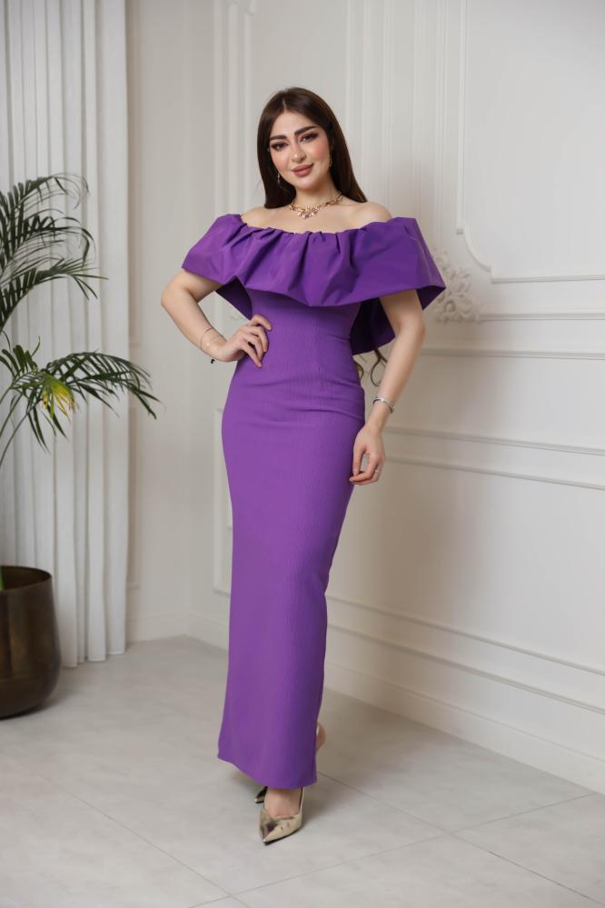 فستان انيق بقصة أوف شولدر ينساب بنعومة على الجسم، يتميز بطبقة تفتة جذابة تغطي منطقة الصدر، تضفي لمسة راقية وأنثوية.