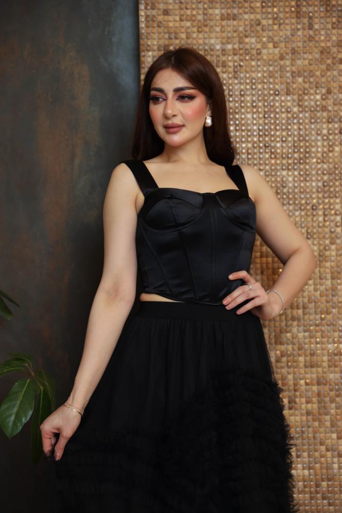 بلوزة حفر بقماش سنان لامع بقصة كروسية وبسحاب من الظهر .