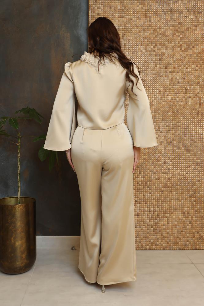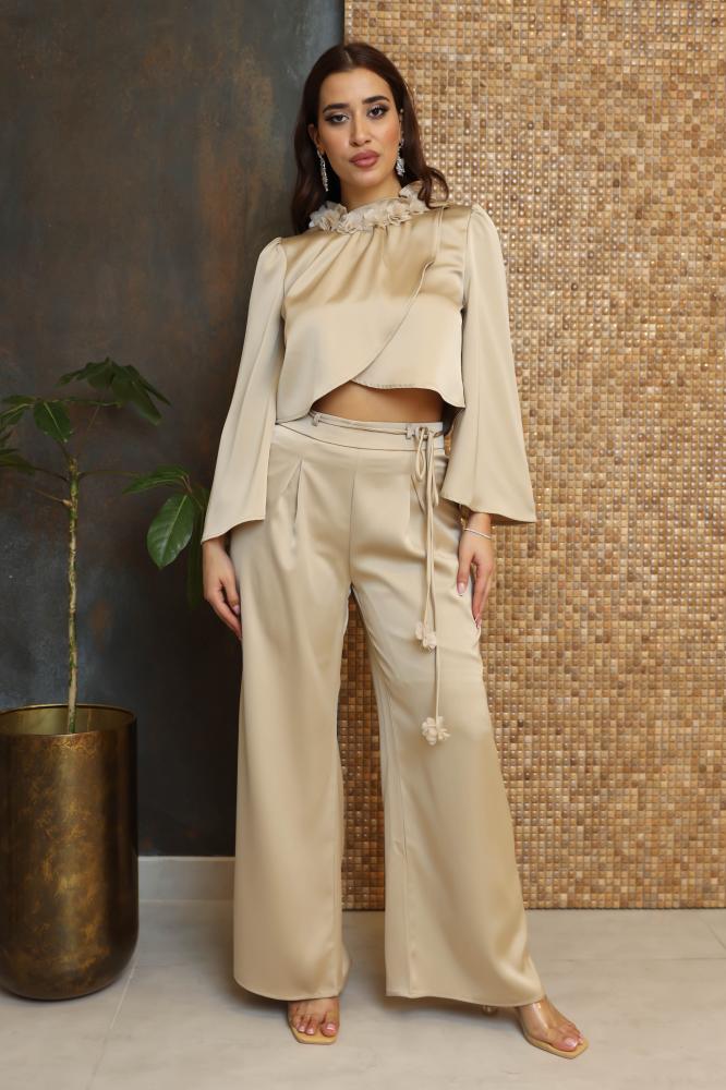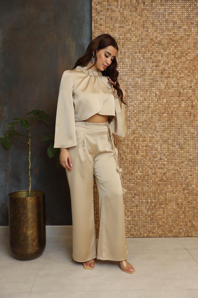 بنطلون حرير بقصة واسعه بكسرتين من الامام وبحزام خارجي