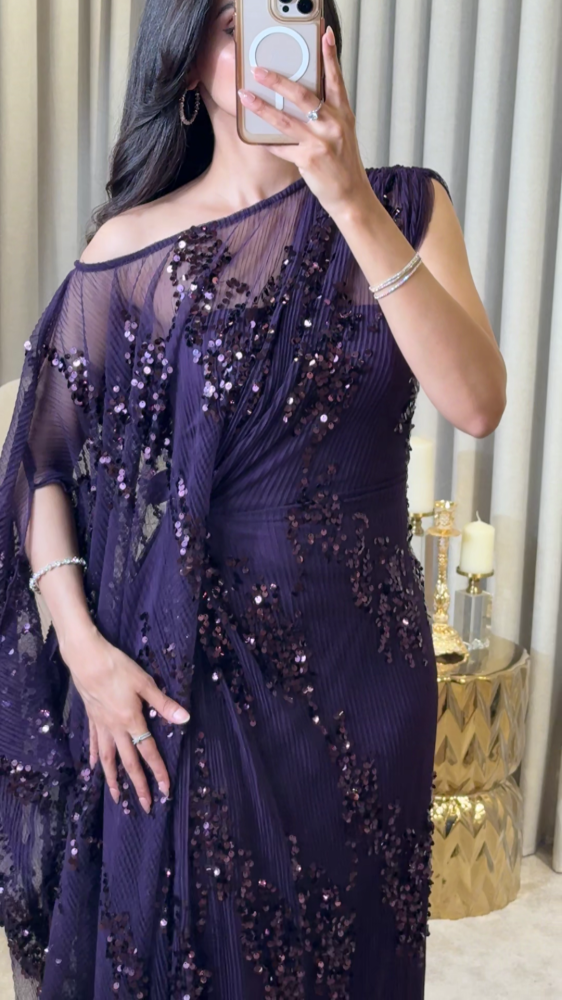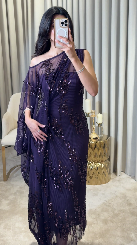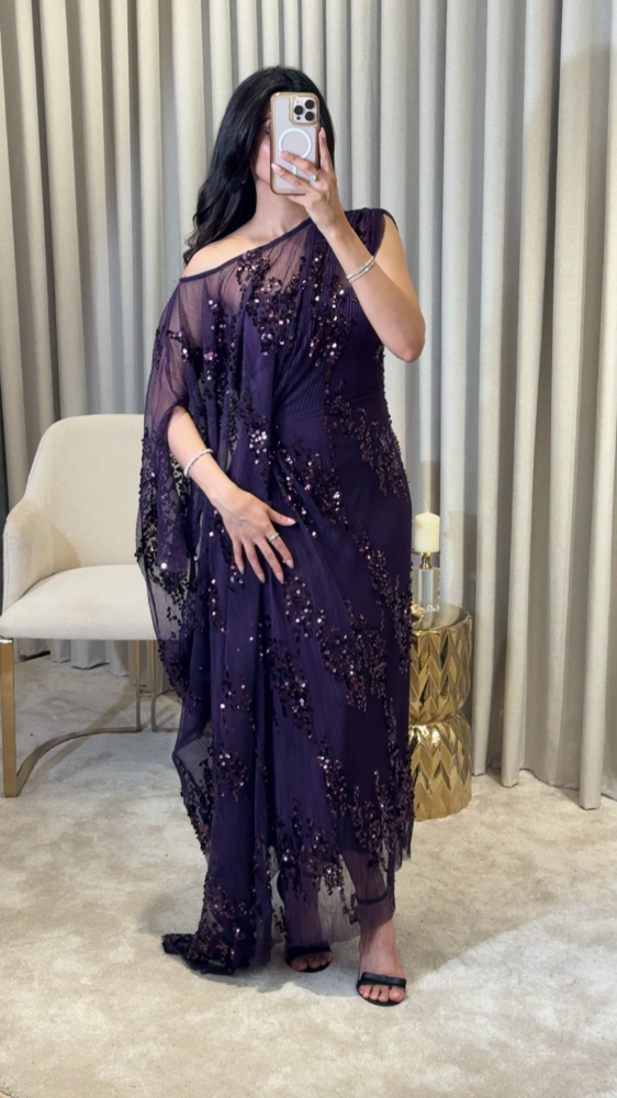 جلابية سهرة شك باللون البنفسجي الغامق، بتصميم أنثوي أنيق مطرز بالترتر اللامع.