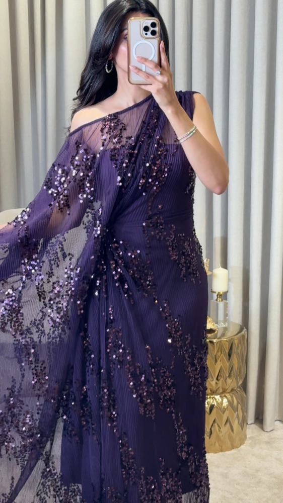 تأتي بتصميم كتف واحد (One Shoulder) مع طبقة تل شفافة مرصعة بالترتر المتناثر بشكل فني يضيف لمسة من البريق والفخامة.