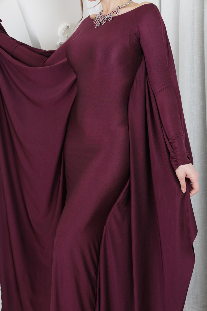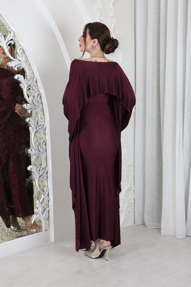 فستان استرتش برغندي ماسك على الجسم بحواف من جوانب الفستان ومن الخلف.