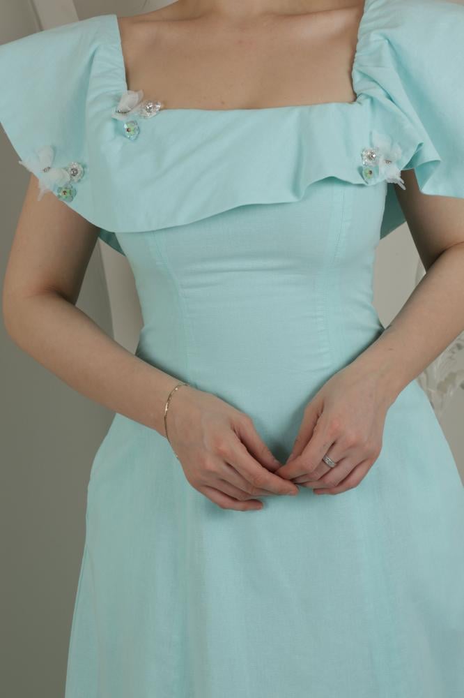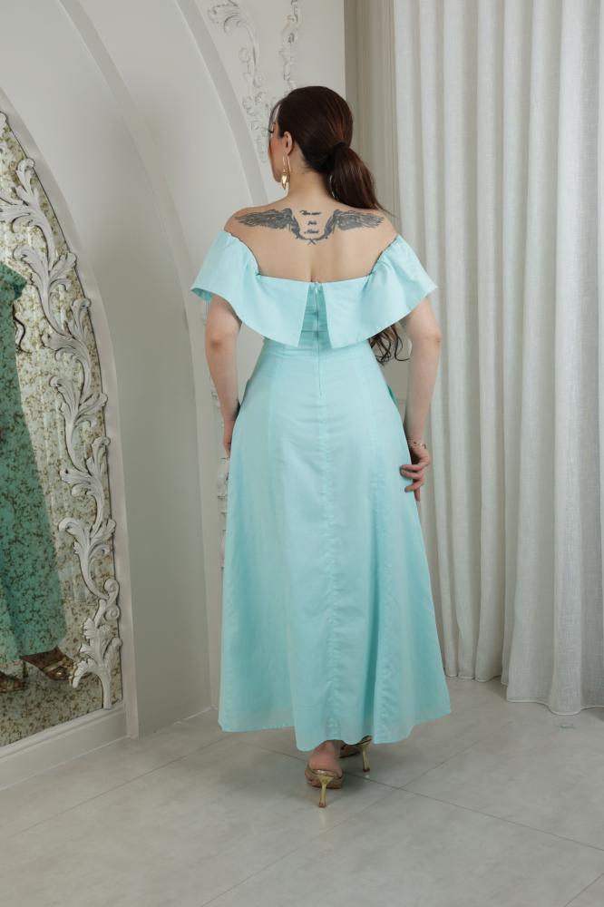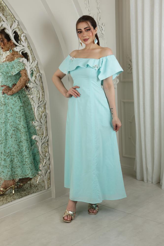 فستان بتصميم أوف شولدر الذي يعكس جمال الأكتاف برقي وجاذبية. مزين بتفاصيل ساحرة من ورود إكسسوار تمنح لمسة رومانسية آسرة. يأتي مع سحاب خفي من الخلف لتوفير لمسة عملية وأنيقة في آن واحد.