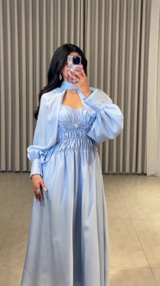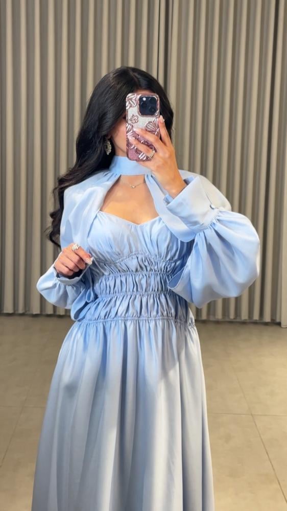 فستان ناعم بقصة مفتوحة من الصدر مزين بكشكشة على الصدر بأكمام طويلة وبياقة مرتفعة.