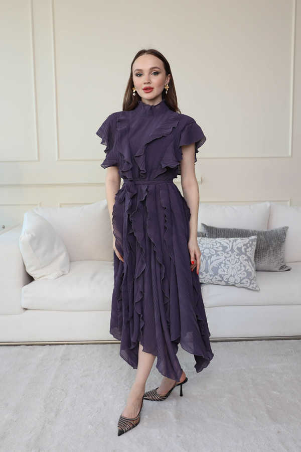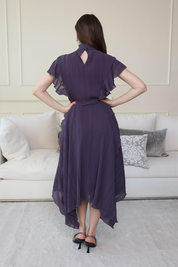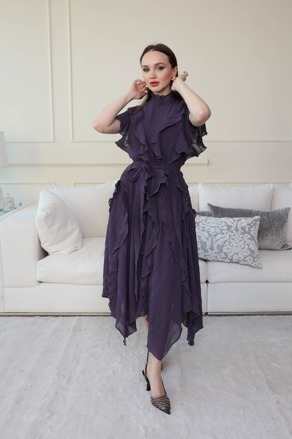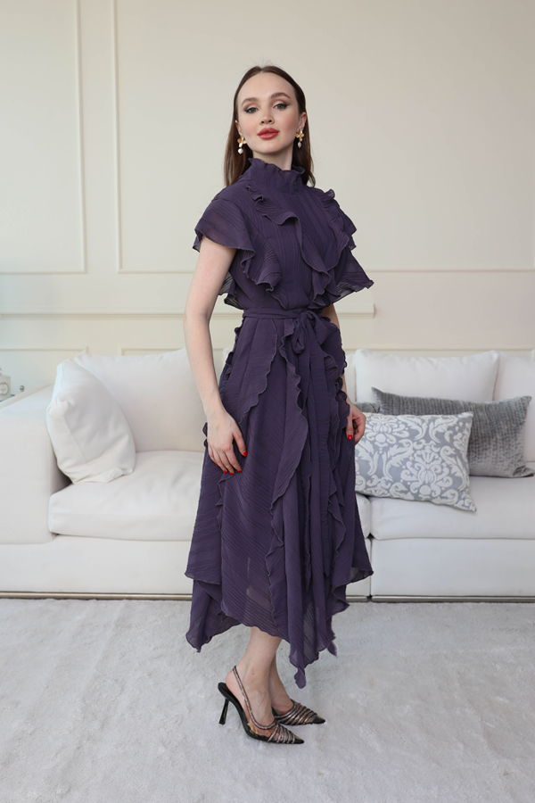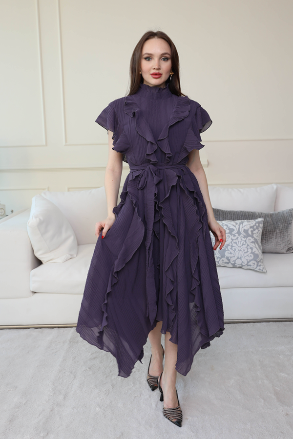 فستان بيلسية غير متماثل الطول بياقة مرتفعة بدلعات على الاكتاف ومن الامام بحزام خارجي .