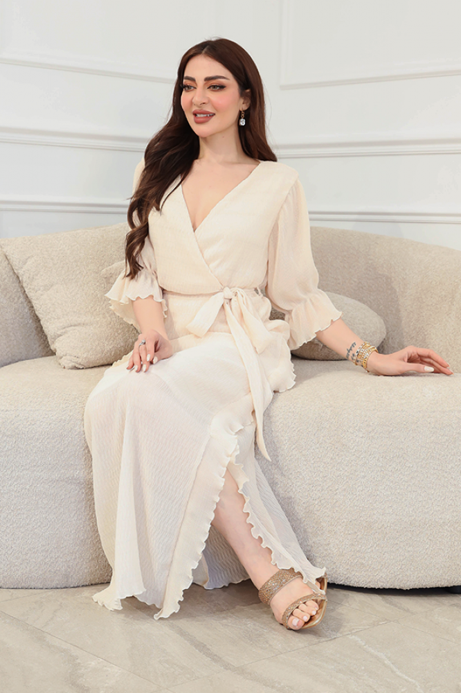 فستان بليسه طويل جميل مزين بكشكشه من الجوانب وبفتحه من الجانب لف من الصدر وبرباط جانبي بأكمام ميد مزينه بزم وكشكشه من الأطراف