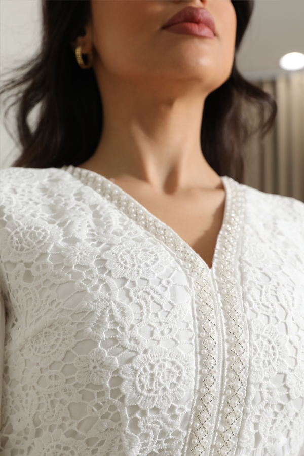 مو طبيعي كيف يجننن 😩🤍كمية اللطافة و الجمال مو معقولة بهالفستان 🥺 جوبير دانتيل ابيض باكمام كسرات وسيعة و السترس مع اللولو من قصة الصدر V و الحزام من الخصر