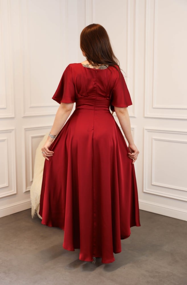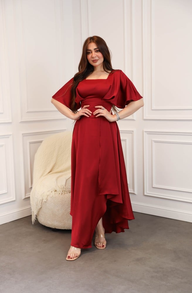 فستان طويل بقماش حرير طايح باكمام واسعة بقصة لف من الاسفل غير متماثل الطول