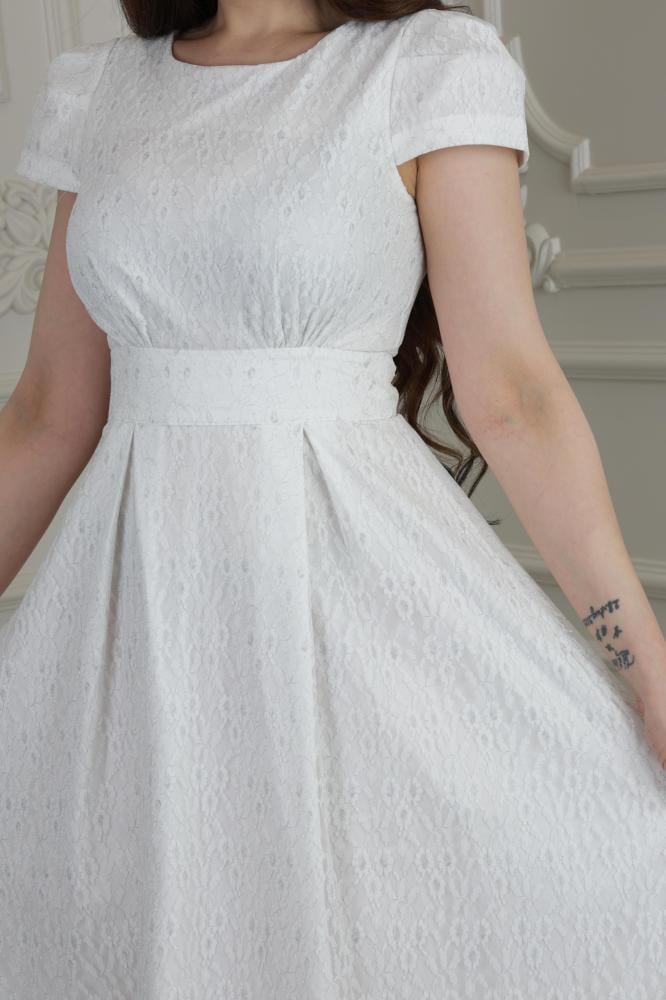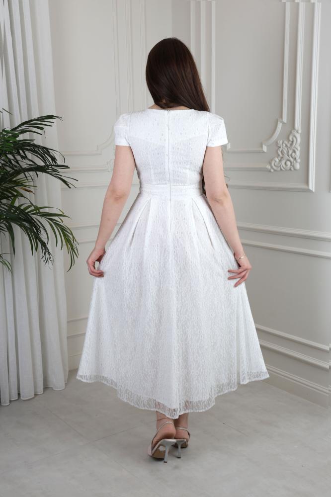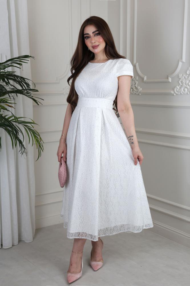 فستان دانتيل كلاسك مزين بتطريز مورد بأكمام قصيرة بياقة دائرية مزين بثنايا على الخصر وبسحاب من الظهر.