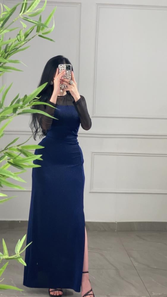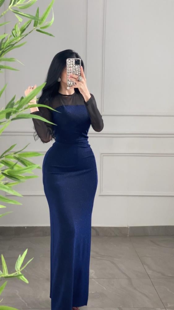 فستان سهره بلمعه بأكمام طويلة بياقة دائرية مزين بتل على الصدر والاكمام وبزم على الصدر من الجانب