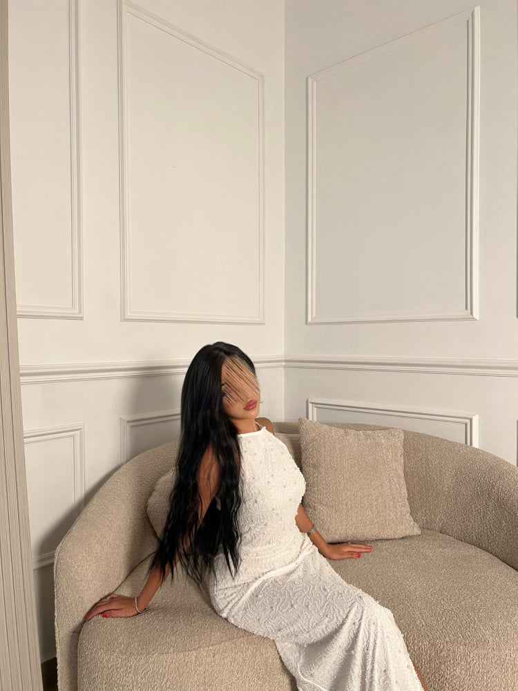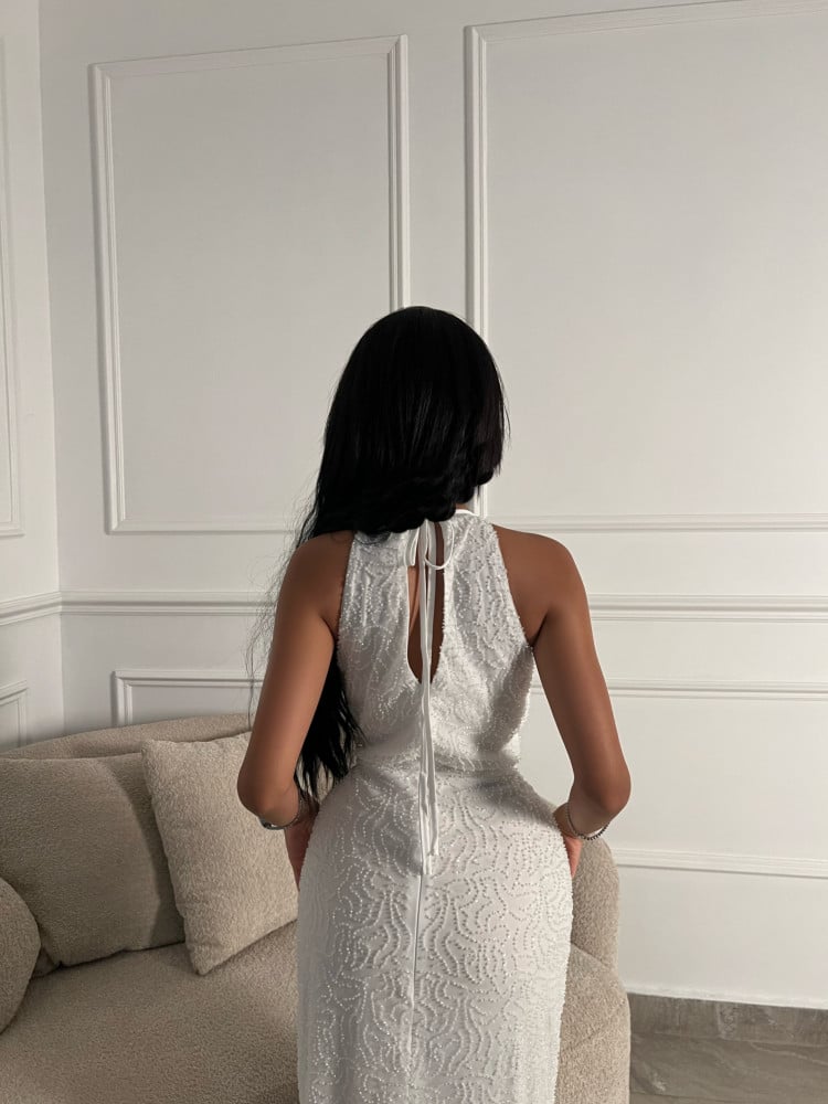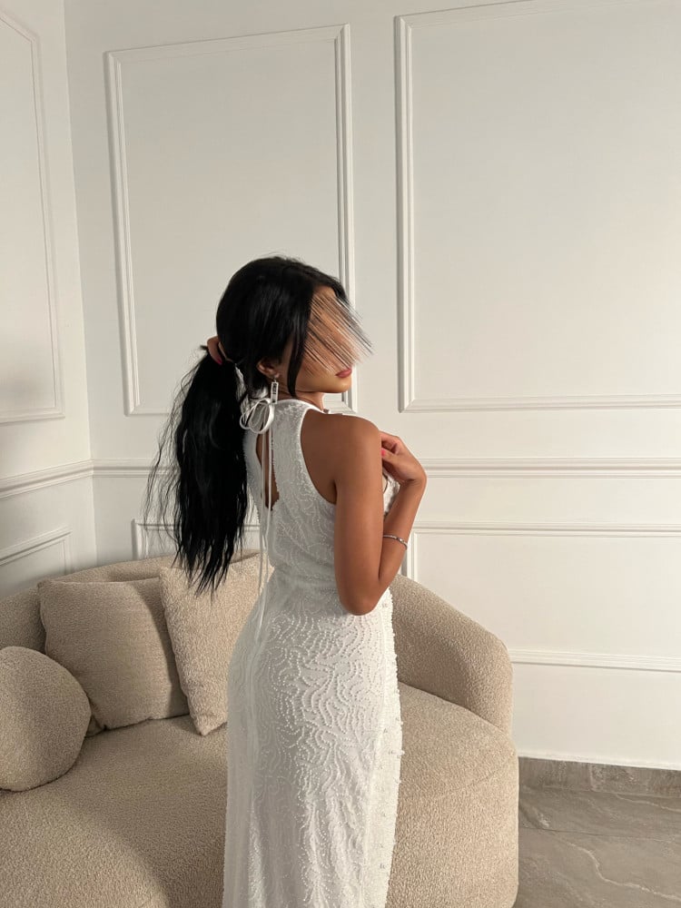 فستان سهره ميد حفر مزين بخرز ولؤلؤ بفتحة على الجانب من الأسفل