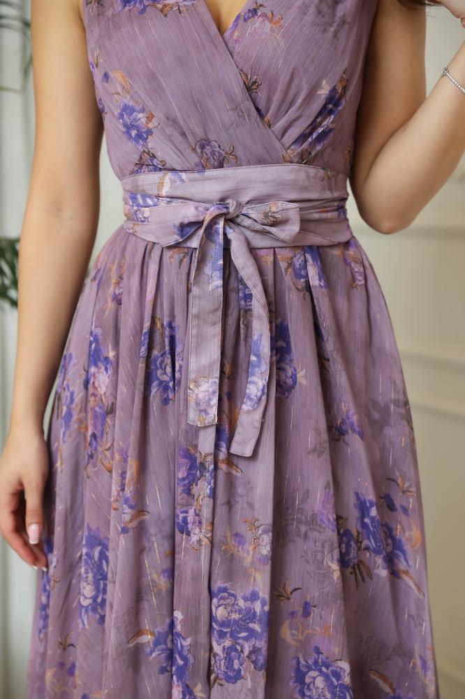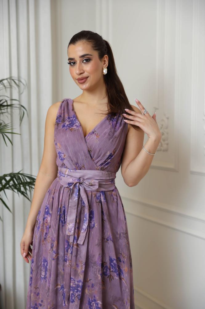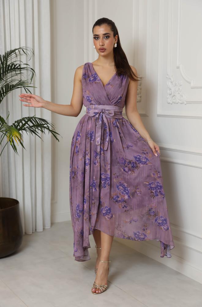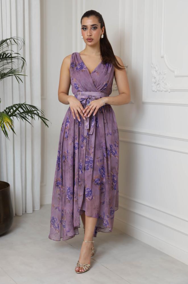 فستان شيفون بطابع الورود غير متماثل الطول بقصه لف من الصدر وبحلقات زم على الاكتاف وبزم من الخصر و بحزام خارجي