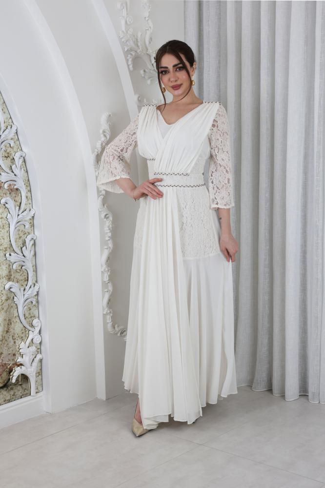 فستان شيفون مزين بدانتيل بقصة لف من الصدر وبأكمام دانتيل مزين بحائكه من الخيوط و الكريستال على الخصر والاكتاف وبدلعه من الامام