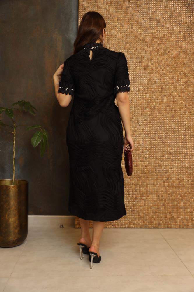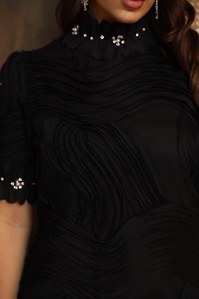 فستان العيد منسوج بتل و شيفون بارز بنمط مموج بياقة مرتفعة مزينه بكشكشه الإكسسوار بأكمام قصيره مزينه بكشكشه واكسسوار من الأطراف