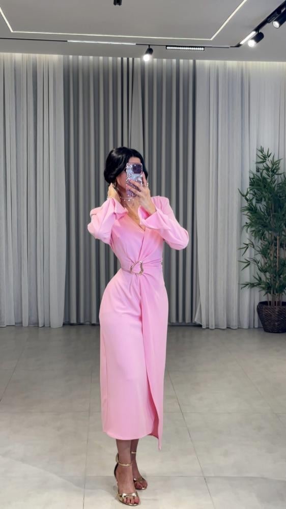 فستان كريب ميد بأكمام طويلة بقصة لف بزم على الخصر مزين بحلقة مذهبة .