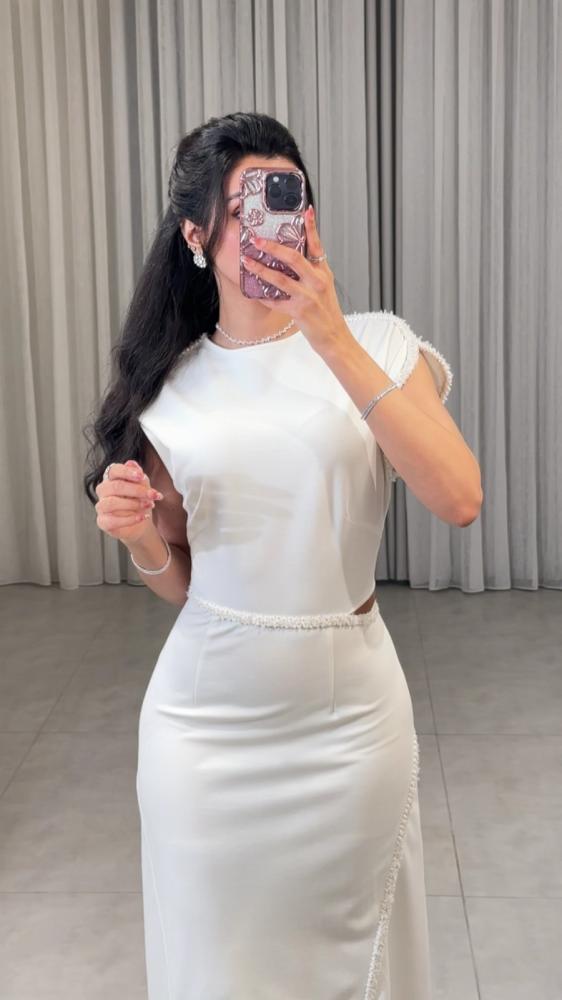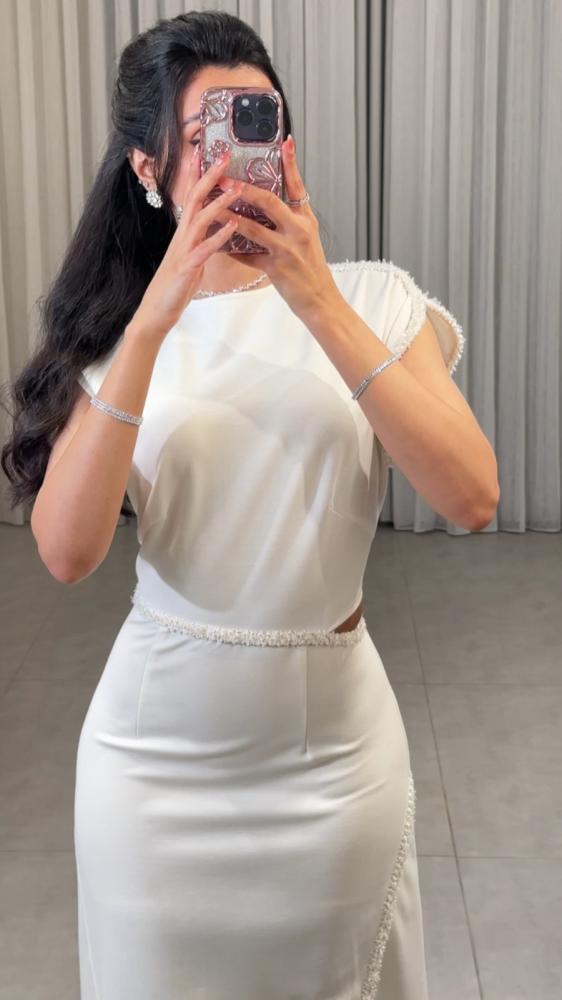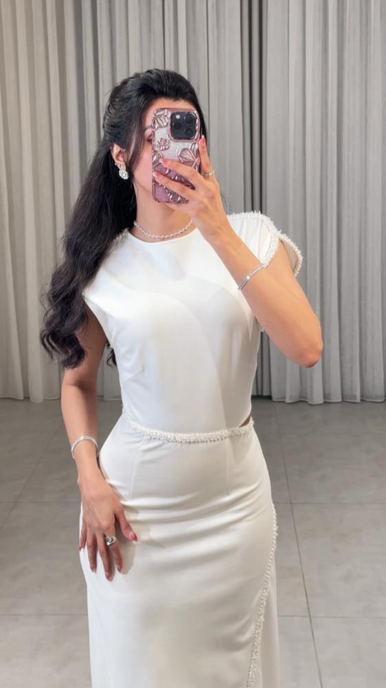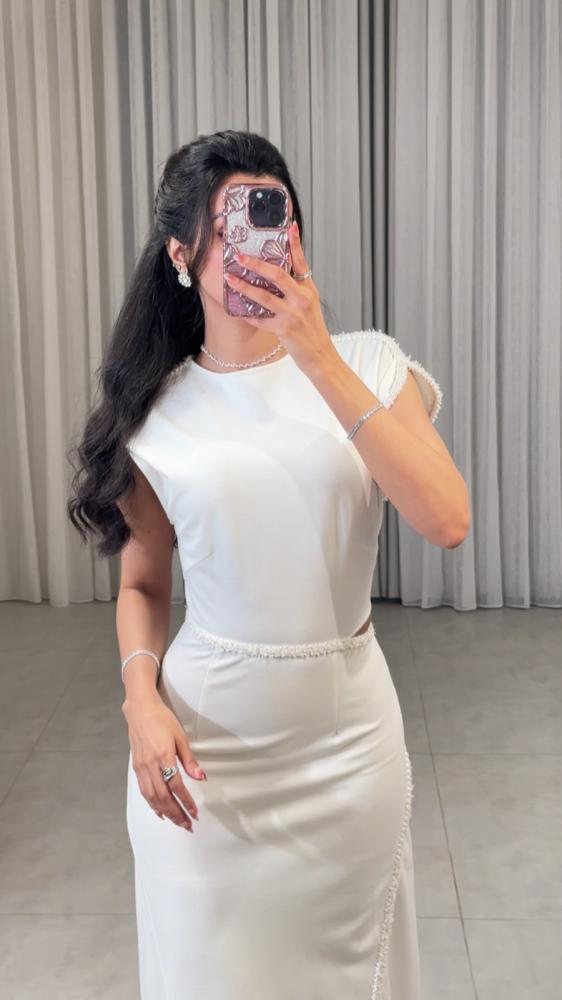 فستان ناعم بياقة دائرية بدون اكمام بقصة عصرية من الخصر ومن الأسفل مزبن بحباكه وترتر مذهب على الاكتاف والخصر ومن الجانب وبفتحه على الخصر