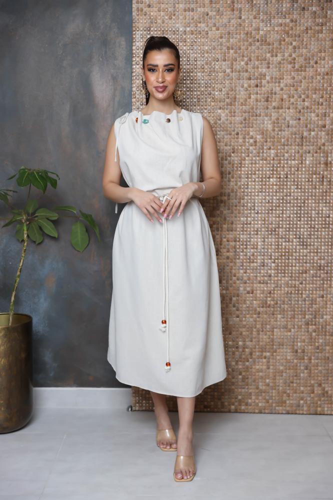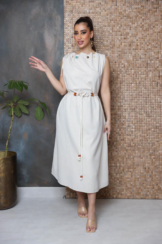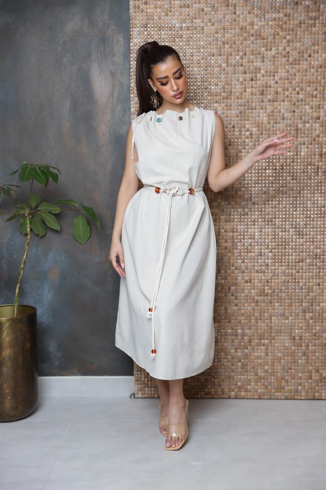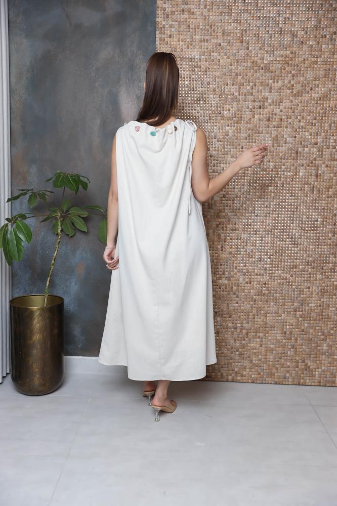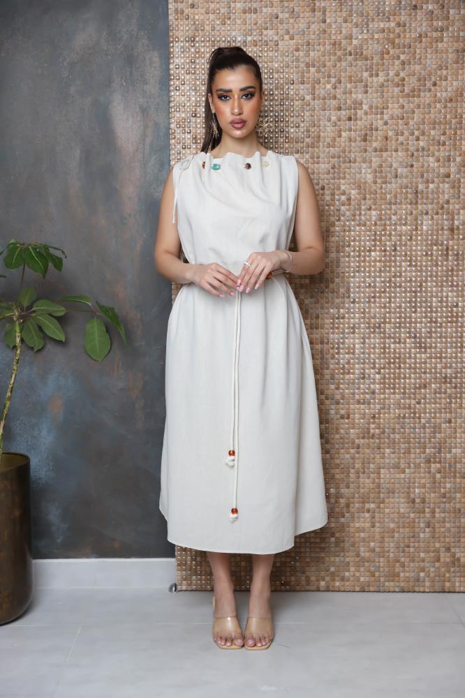 فستان بقصة واسعة بدون اكمام مزين بثنايا على الرقبة وبأحجار كريمة