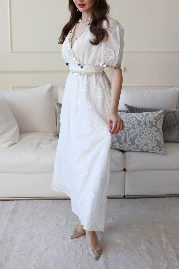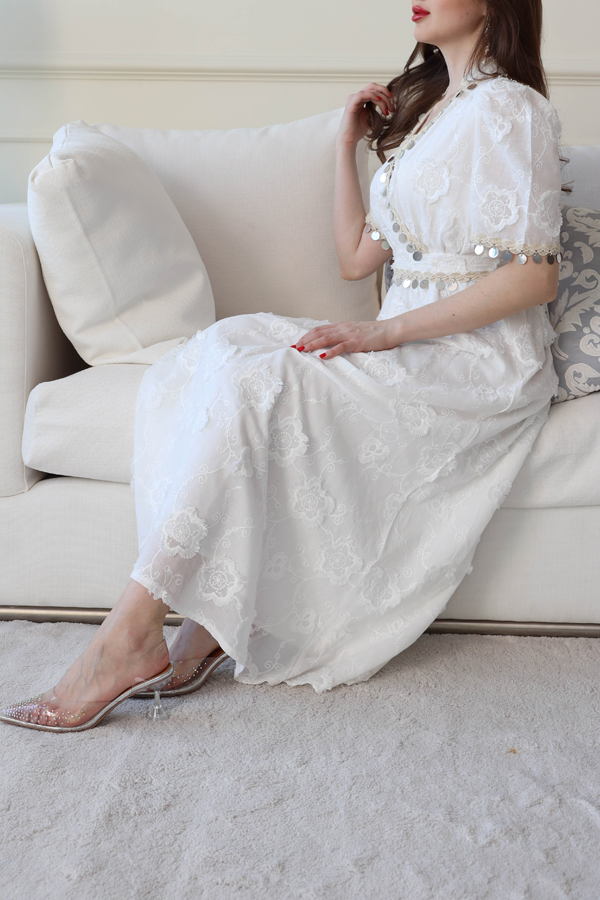قفطان بقصه لف مزين بترتر كبير وتطريز بأكمام قصيرة بحزام خارجي مزين بترتر وتطريز