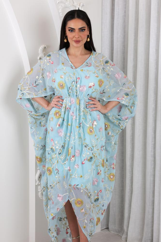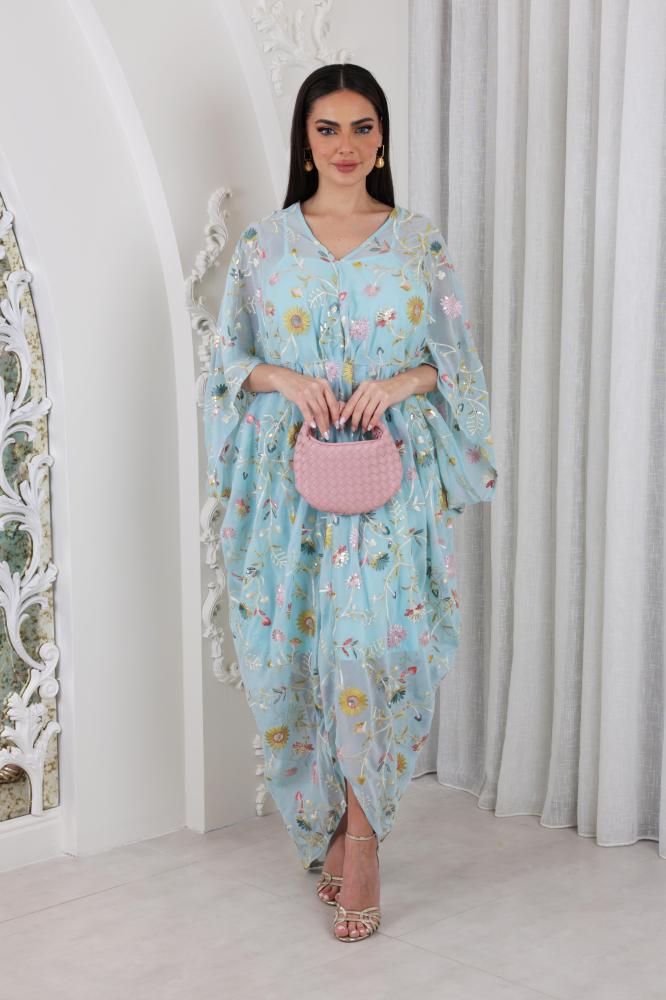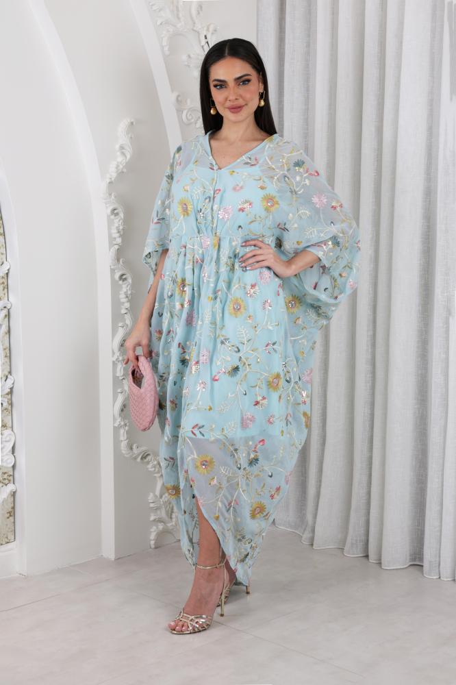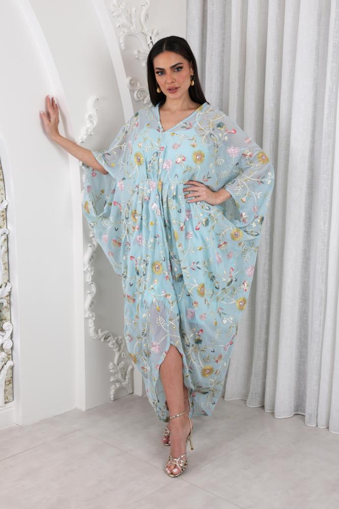 قفطان قطعتين مزين بتطريز بنمط الزهور بياقة V مزين بطيات على الخصر