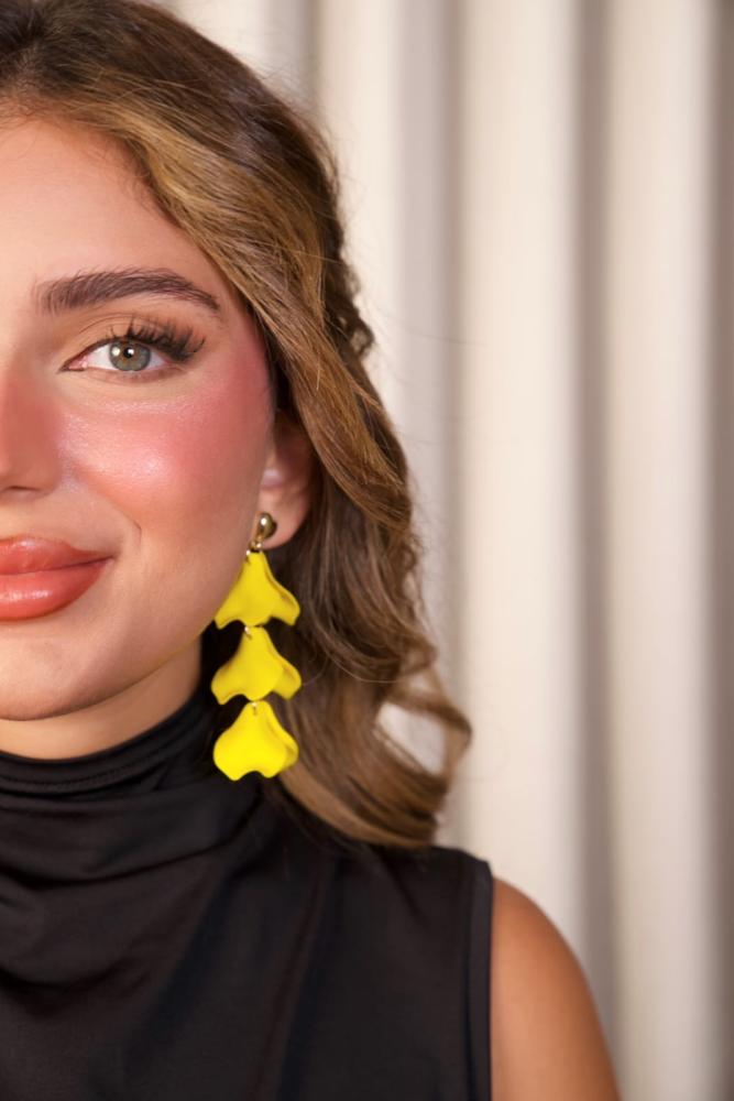 تألقي بإطلالة نابضة بالحيوية مع هذه الأقراط المتدلية ذات التصميم الزهري الجريء، والمكونة من ثلاث زهور صفراء متدرجة تتراقص بانسيابية مع كل حركة. تصميم مبتكر ينبض بالحياة ويمنحك حضورًا مشرقًا يخطف الأنظار، مستوحى من الطبيعة بألوانها الزاهية وتفاصيلها الحيوية.